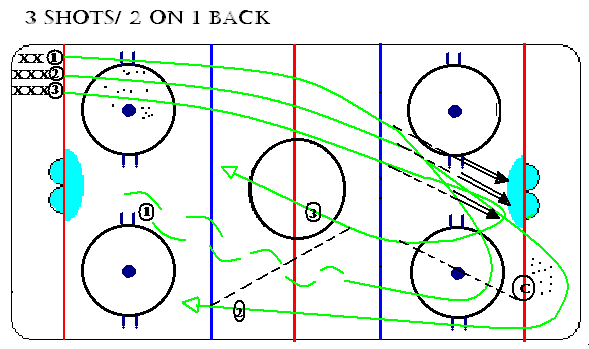 Keys: Shots only (NO DEKES) on the 1st phase. Stagger the shooters! Coach pass to player 3 to set up the 2 on 1. The next group goes after the 3rd player shoots.