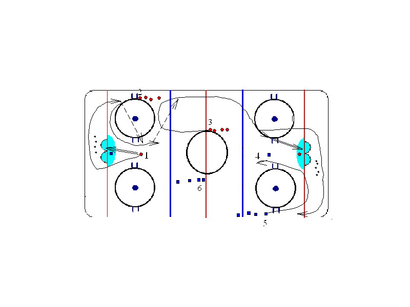 I will explain one end but both ends start at the same time. #1 shoots the puck on the goalie then swings behind the net and picks another puck up, makes a turn in the corner where he passes off to #2, who has made a swing around the circle and receives the pass before the blue line #2 inturn makes a pass to #3 who has made a turn just below the blue line and will receive the pass from #2 before hitting the center red line. #3 the skates a few strides and takes a shot on the goalie then swings behind to pick up a puck and start #5 & #6 the other way. This drill is continuous.