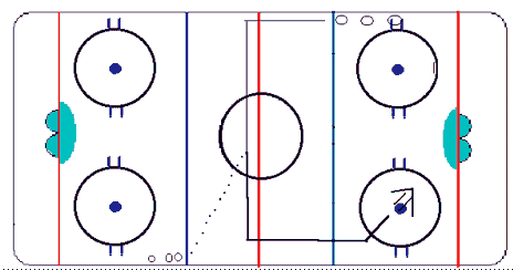 3. Third progression same as step two. Except the player passing the puck becomes a third attack man. This makes the second skater drive to the net while the third player who passed the puck becomes the high man.