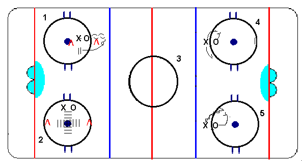 Four drills are indicated on the diagram. Each illustrates and prepares players for a body contact situation. Key concepts are primary vision on the attackers chest, maintaining gap control through skating skills (turns, pivots, lateral skating, stops and starts, agility and balance), playing offensive man "inside out", eliminating or taking away ice, body awareness, stteering, angling and using body contact (not body checking).