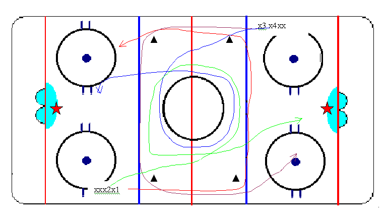 X2 and X4 start right behind X1 and X2 in their respective lines and skate around the faceoff circile as shown. They then take the defensive position so that X3 is skating with the puck on X2 and X1 is skaing with the puck on X4.